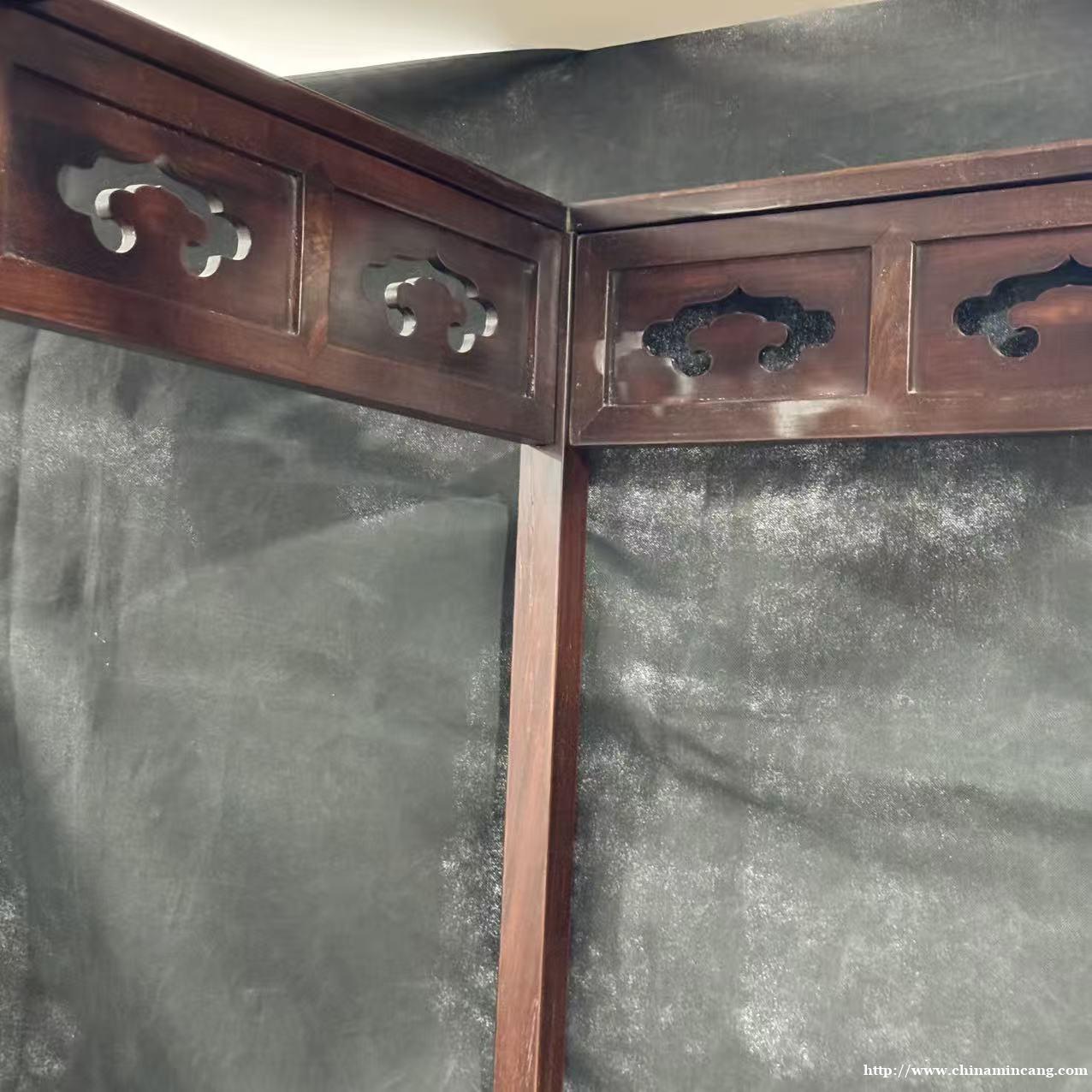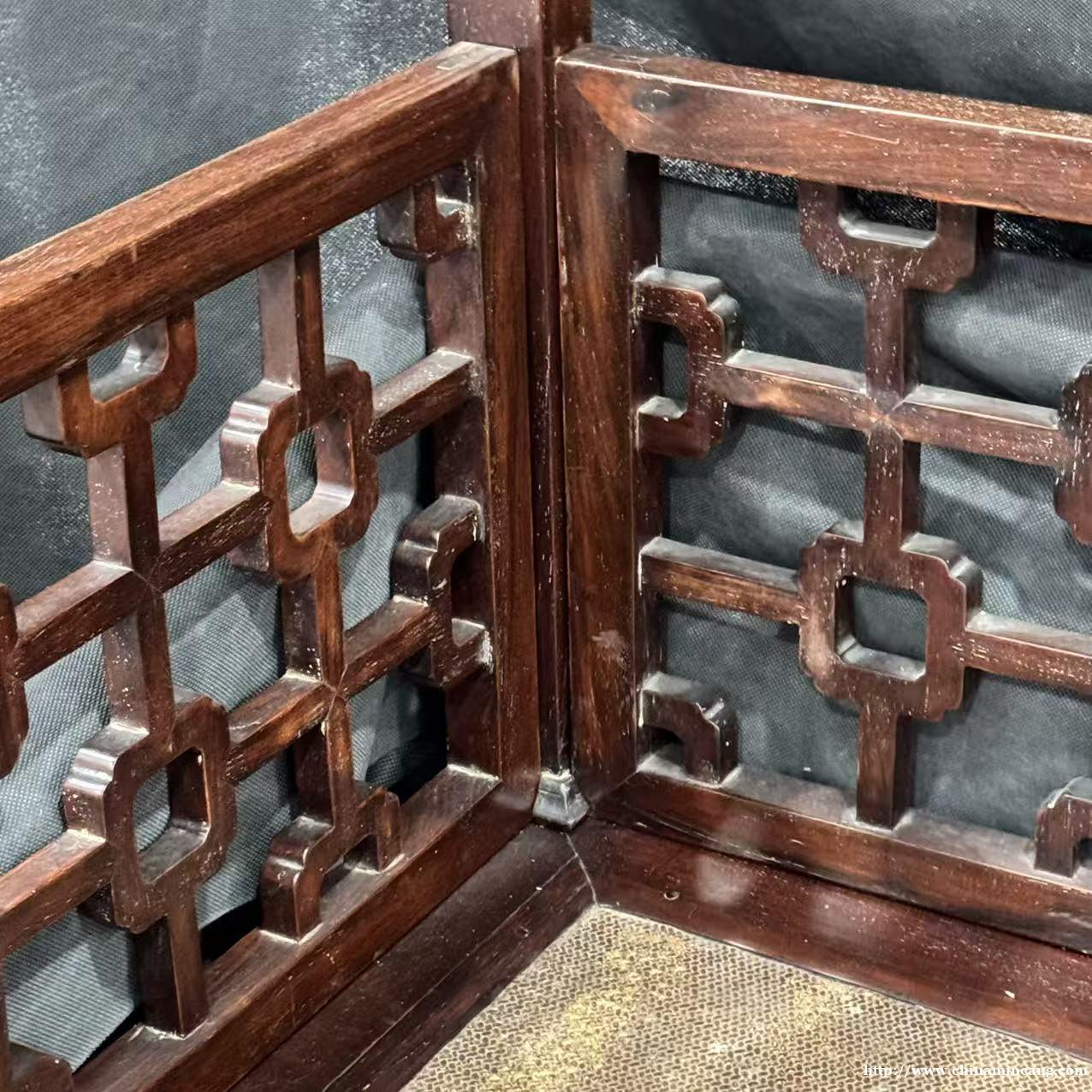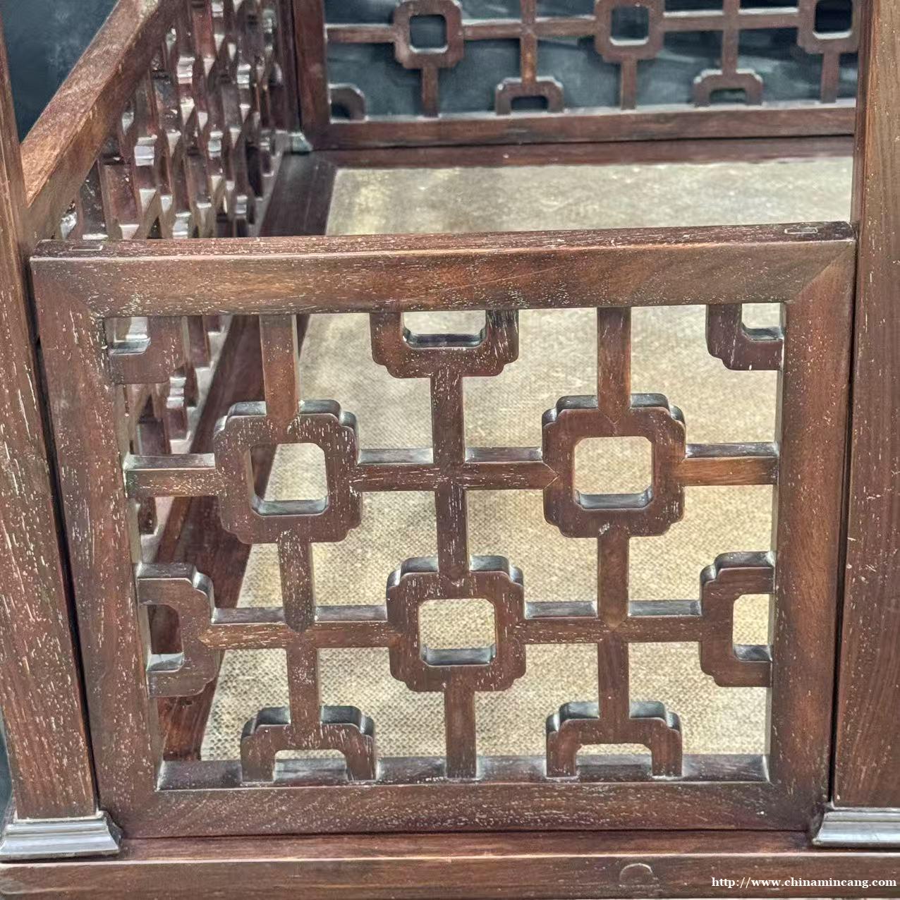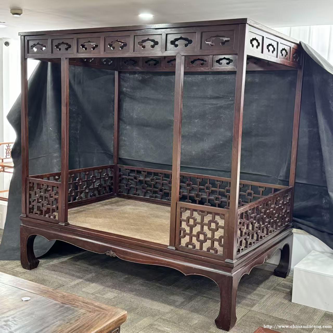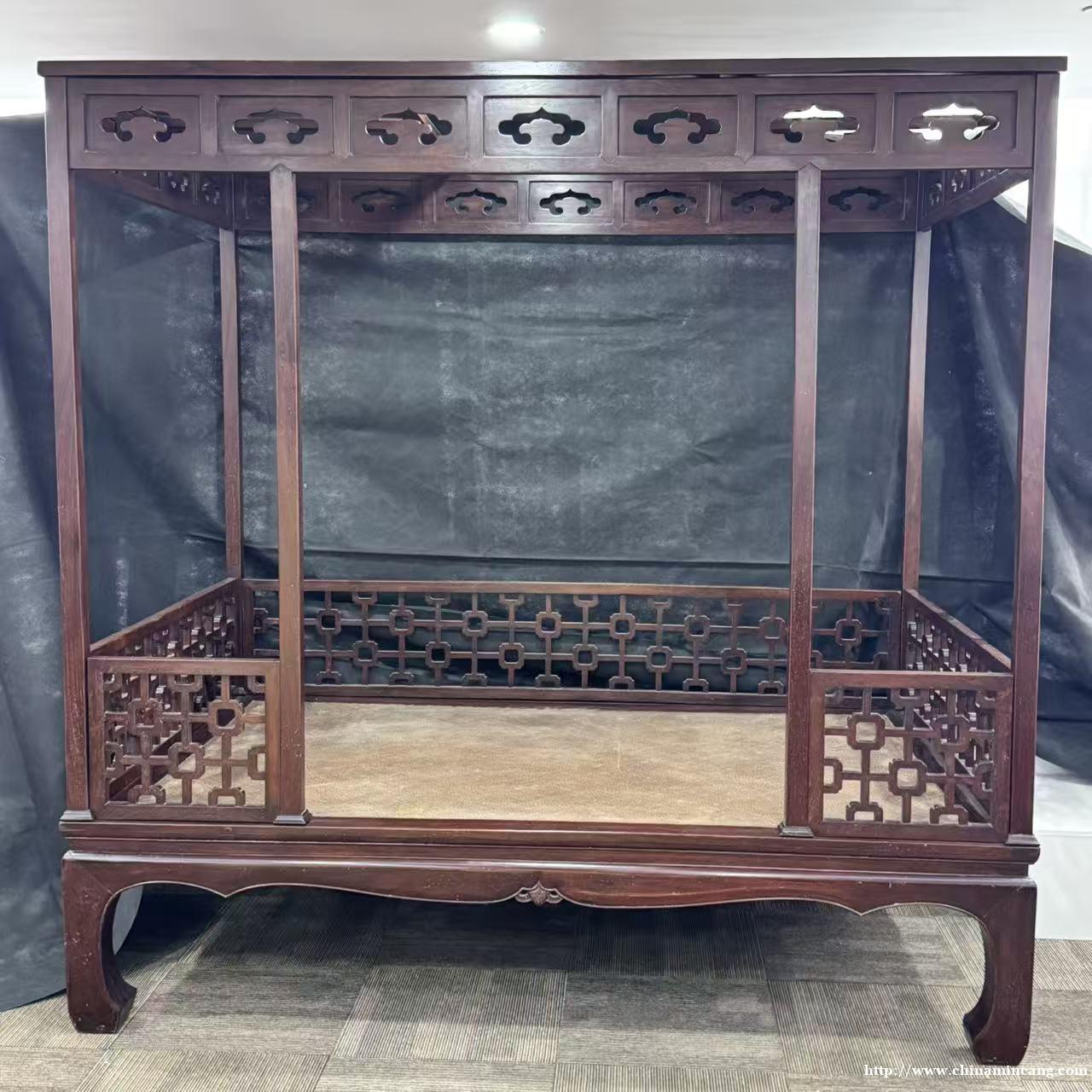 此架床甄选黄花梨大料成器,质地坚密温润,纹理行云流转,包浆醇厚古雅,尽显百年红木风华。整体取“四柱”规制,床顶围棚透雕饰如意云头纹,寓意吉祥;床围子满饰规整几何连环纹,镂空透雕工艺精湛,线条利落,极具东方秩序美感。床足做工考究,弧度优美,整体榫卯结构严谨扎实,稳固千年。兼具实用与至高审美,是清代黄花梨家具中的重器,亦是收藏陈设的顶级珍品。