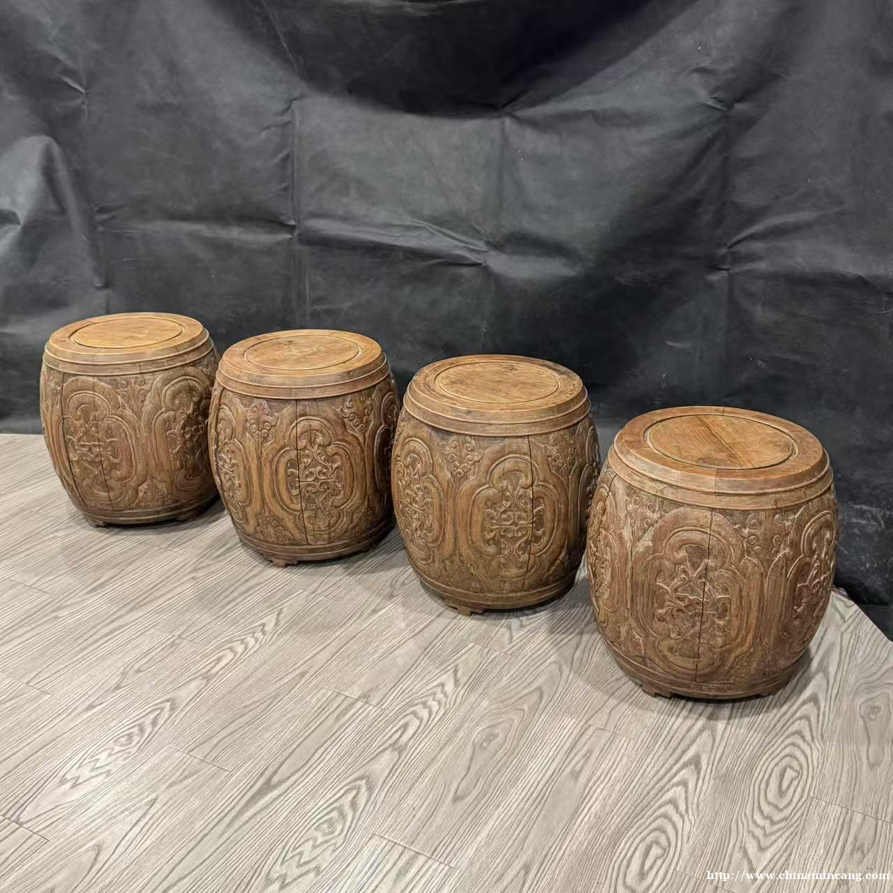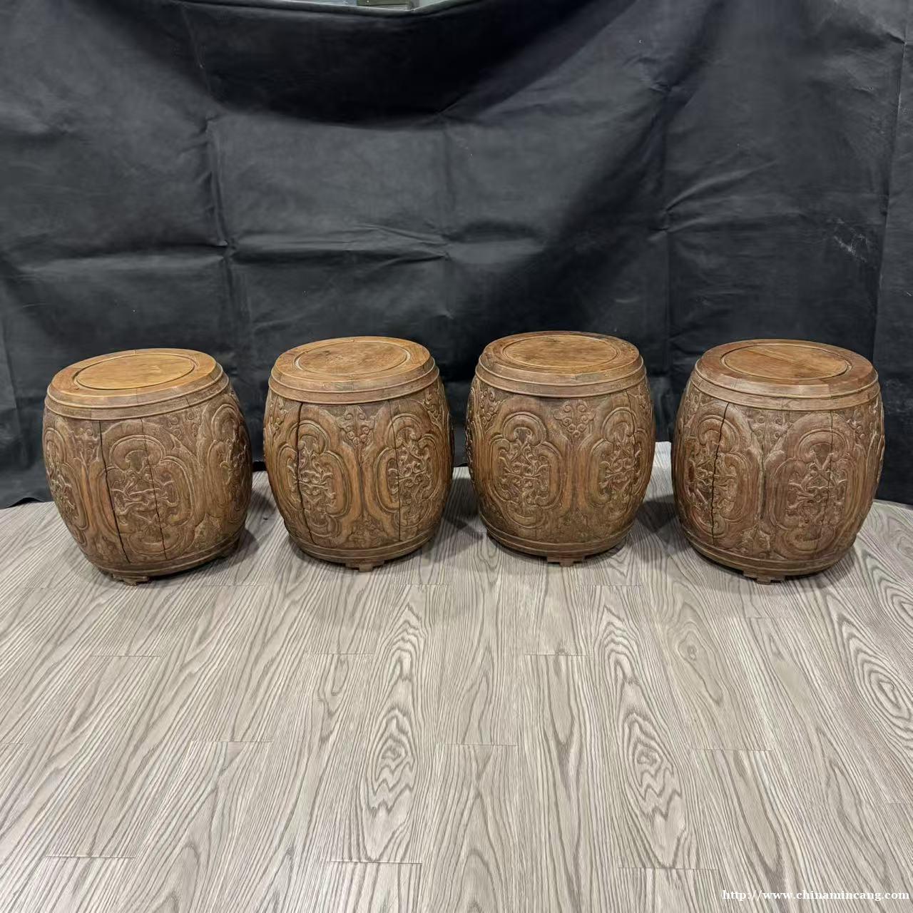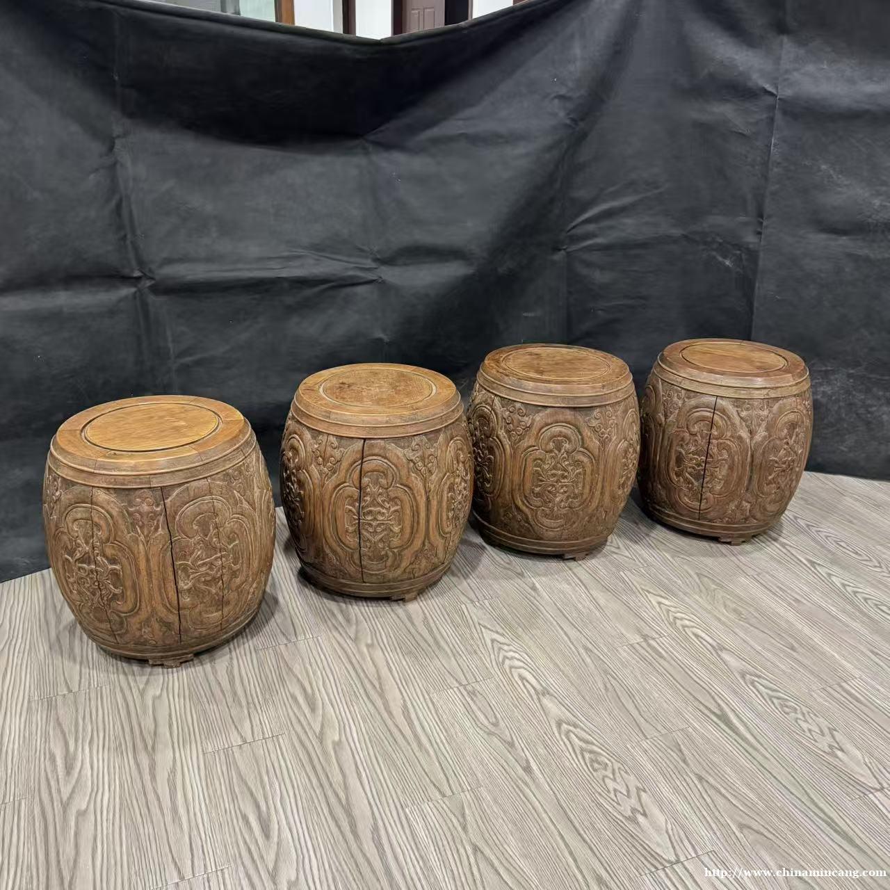 这四件清代黄花鼓凳,是传统中式家具的美学典范。器型仿鼓式造型,鼓腹饱满,寓意圆满吉祥,底承三足,整体比例协调,尽显古典韵味。
