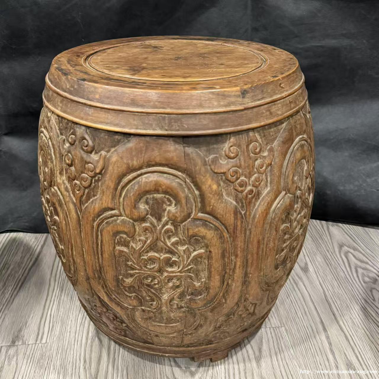主体选用黄花梨材制作,色泽温润柔和,天然纹理清晰舒展,或隐现灵动纹理,尽显木材的自然意趣。凳身通体满工浮雕吉祥纹样,构图饱满,刀法圆润流畅,纹饰立体感强,展现了清代工巧的雕刻技艺。