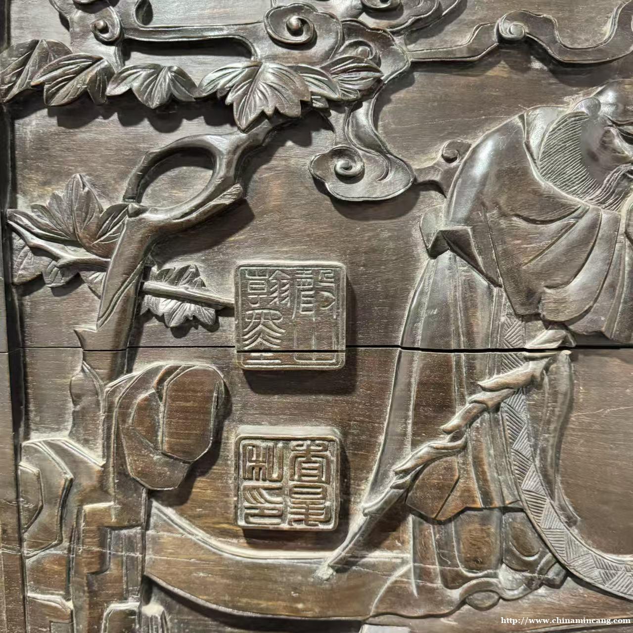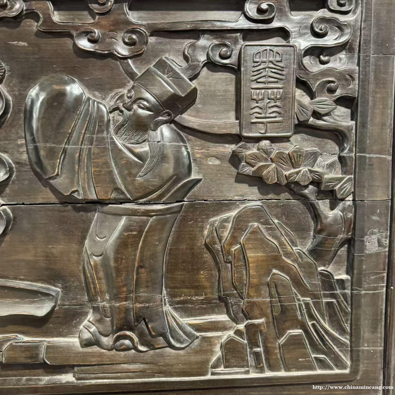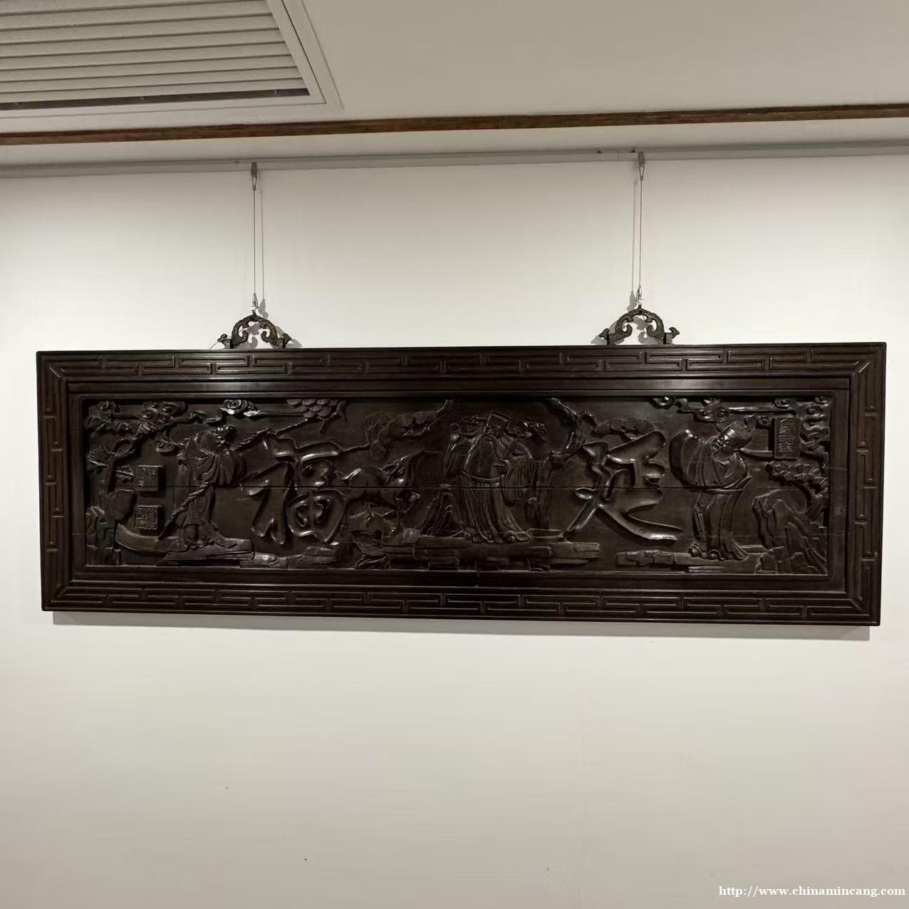 匾面正中浮雕“福延”二字,字体苍劲有力,行云流水,四周环绕人物松竹纹样,构图饱满,层次分明。刀法圆润娴熟,细节处打磨精细,既展现了清代造办处的精湛技艺,又传递出“福泽绵长、福寿绵延”的美好寓意。