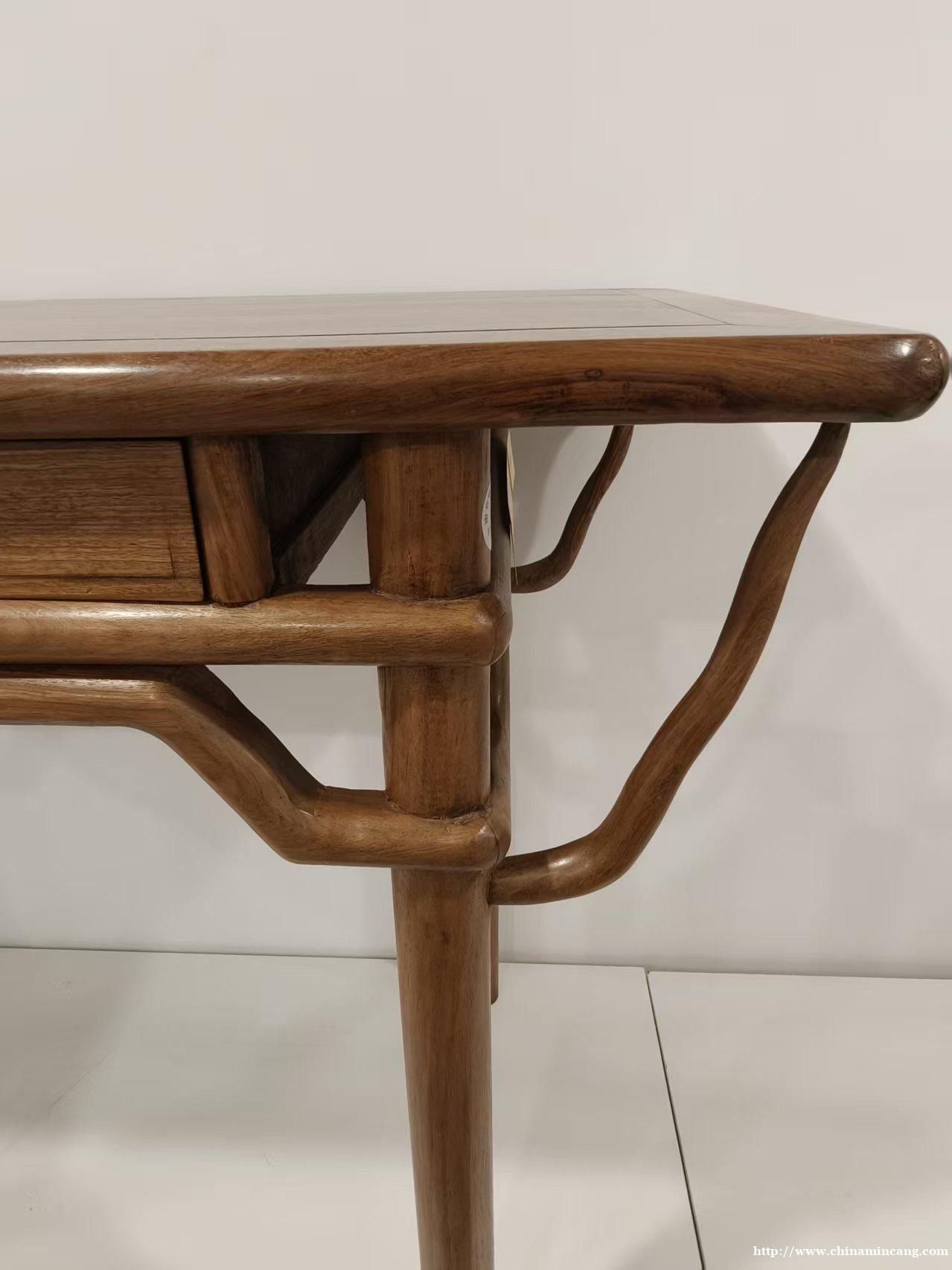 其工艺精湛,桌身采用传统榫卯结构,衔接紧密牢固,历经岁月仍稳固扎实。抽屉五金配件虽为旧制,却与整体风格相得益彰,既保留了实用功能,又兼具极高的陈设与收藏价值,是中式古典家具中兼具颜值与实用性的佳作。