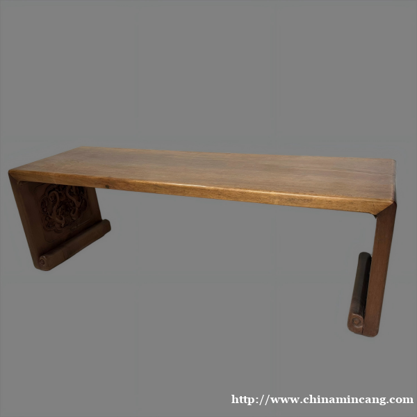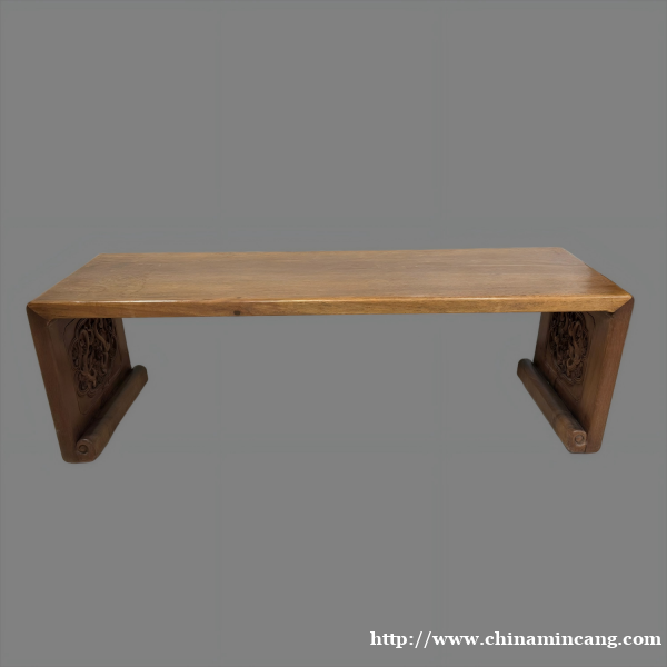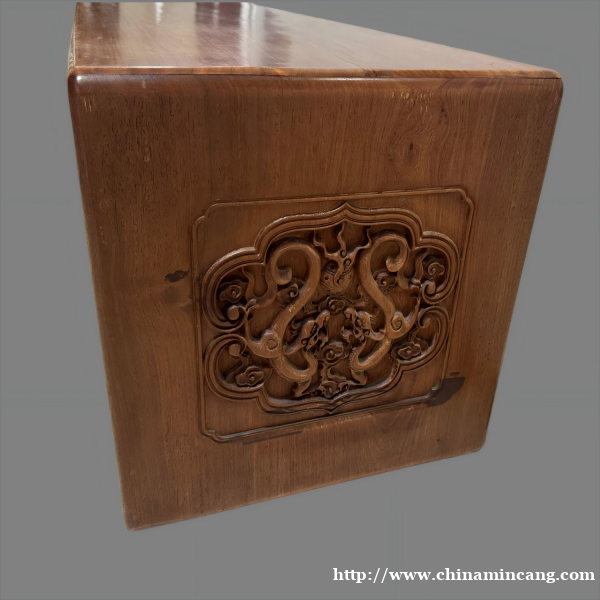 主体选用黄花梨打造,木质色泽温润柔和,纹理清晰灵动,鬼脸与水波纹路自然交织,尽显木材的天然之美。桌牙边沿雕刻缠枝花卉,构图饱满,刀法圆润流畅,细节处打磨精细,彰显清早期宫廷造办处的精湛技艺。