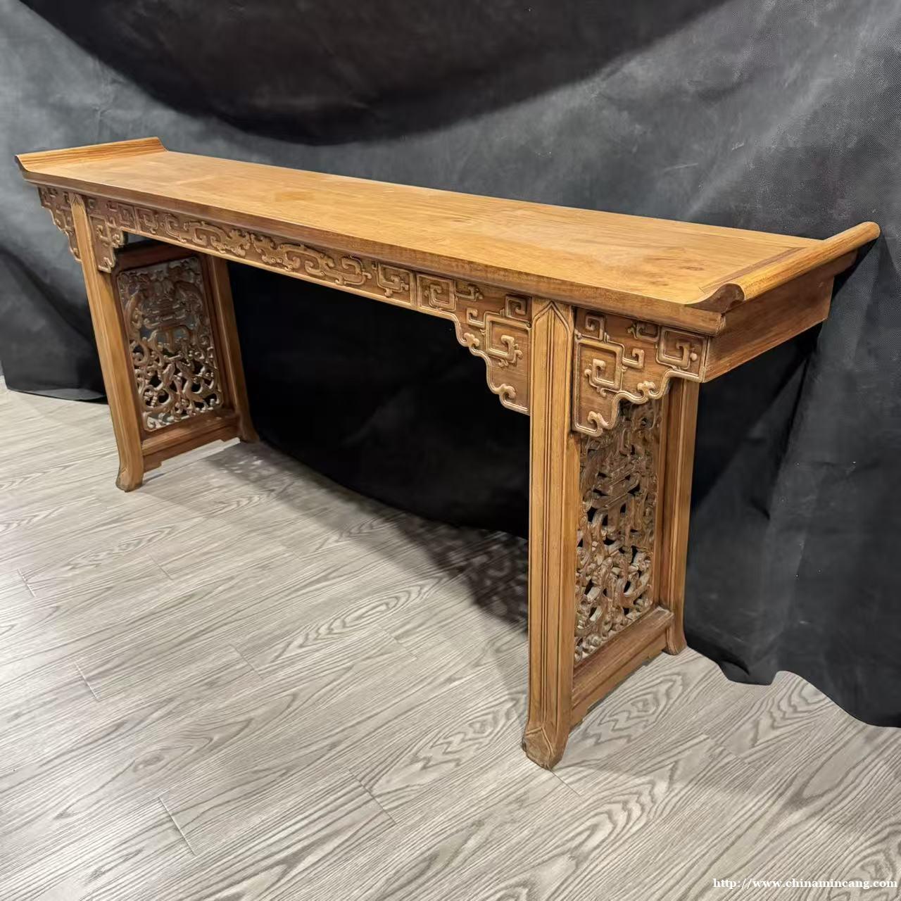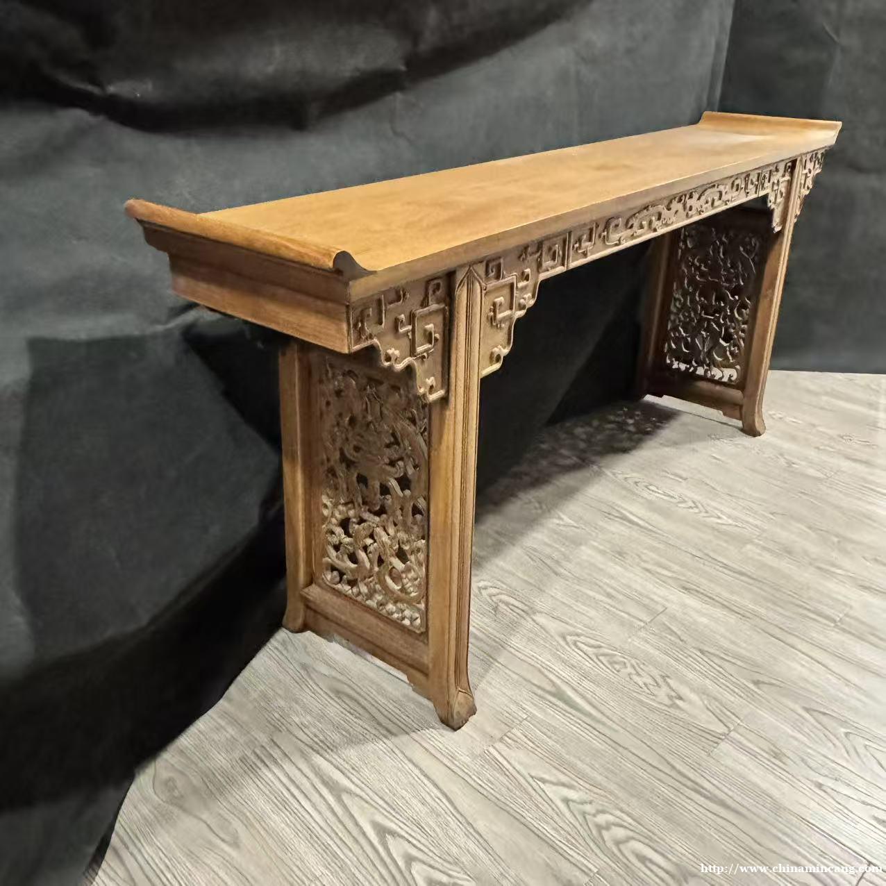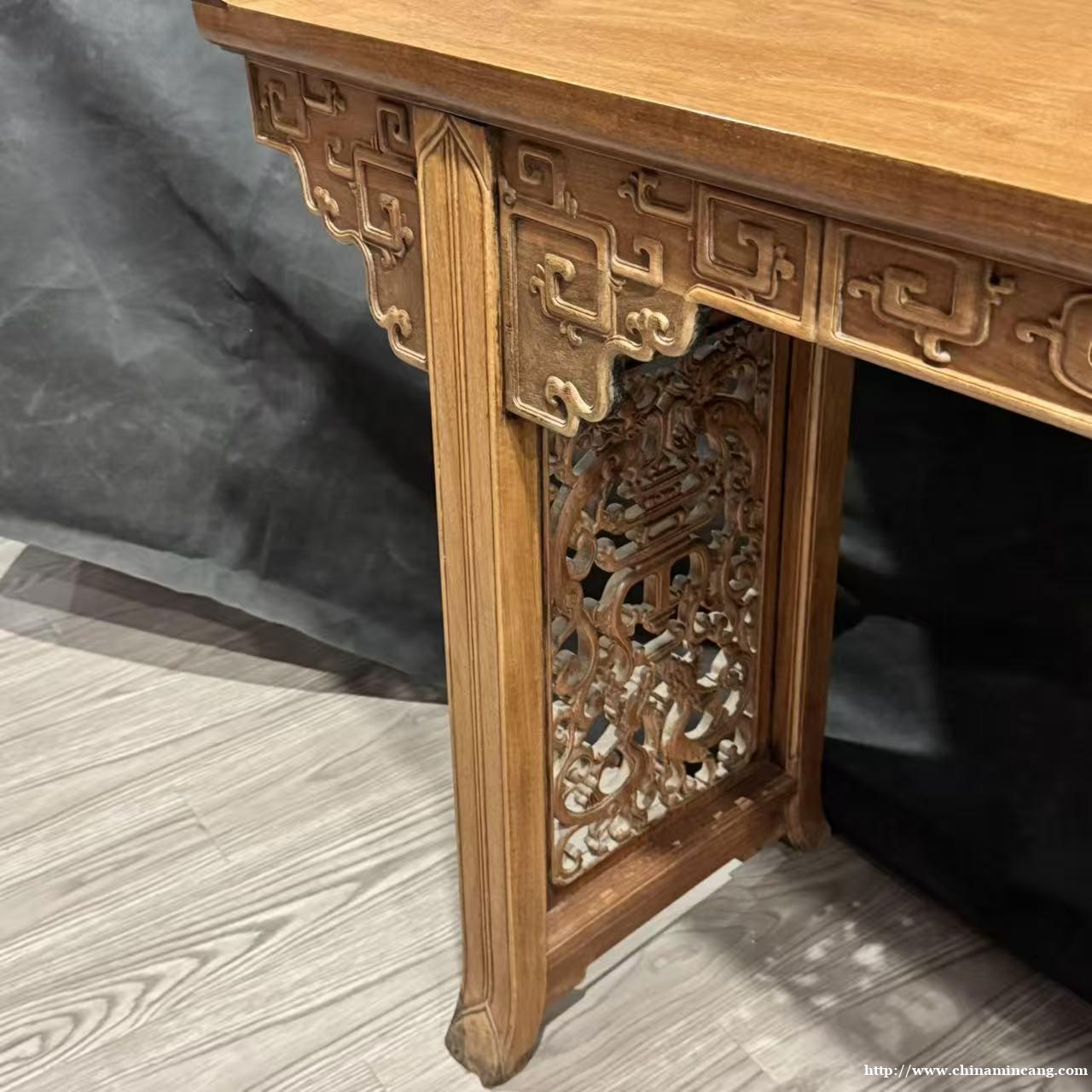 主体选用黄花梨打造,木质色泽温润柔和,纹理清晰灵动,鬼脸与水波纹路自然交织,尽显木材天然之美。案身通体饰纹,牙板饰回纹一周,构图规整严谨,寓意连绵不断;中部高浮雕双龙戏珠纹样,龙姿矫健,刀法圆润流畅,层次分明,彰显清早期造办处的精湛技艺。