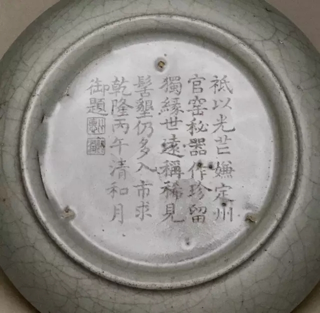 这些刻字基本上都是当时乾隆玩瓷过程中的一些心得体会,相当于课堂小笔记。比如汝窑是玛瑙入釉的,这个观点在我们现在看来可能是值得商榷的,但当时乾隆就是这么认为的。再举几个具体的例子吧,这件汝窑盘子,底部就有乾隆的御题诗:“祗以光芒嫌定州,官窑秘器作珍留,独缘世远称稀见,髻垦仍多入世求。”