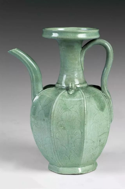 口径7.7、底径7、高20厘米。浅盘口,细长颈,八棱腹,圈足外撇。流长而弯曲,把手背中间被分成两股,肩部置有一对系,中间亦分成两股。腹部的每个区域内都用细线划满花叶纹。通体施淡青釉,圈足内部也有釉,足端无釉。此件执壶制作规整,纹饰优美,为注酒器。初创时期的龙泉窑较多地烧造淡青釉产品,生产年代大致在北宋早期。这一时期生产的产品带有强烈的越窑风格。越窑是宋以前浙江的制瓷中心,唐五代时期是越窑发展的巅峰时期,进入北宋以后快速走向衰落直至停烧。关于越窑停烧的原因,目前主要的观点是唐五代时期越窑生产规模快速扩张导致燃料不足。越窑的部分工匠转移到龙泉地区烧造瓷器,因此早期的龙泉窑青瓷产品带有强烈的越窑风格。这件淡青釉执壶的八棱腹与唐代越窑生产的八棱净瓶十分相似,线条纤细的划花纹饰也是五代宋初越窑产品的特色之一。这件执壶年代应该在为北宋早期。
