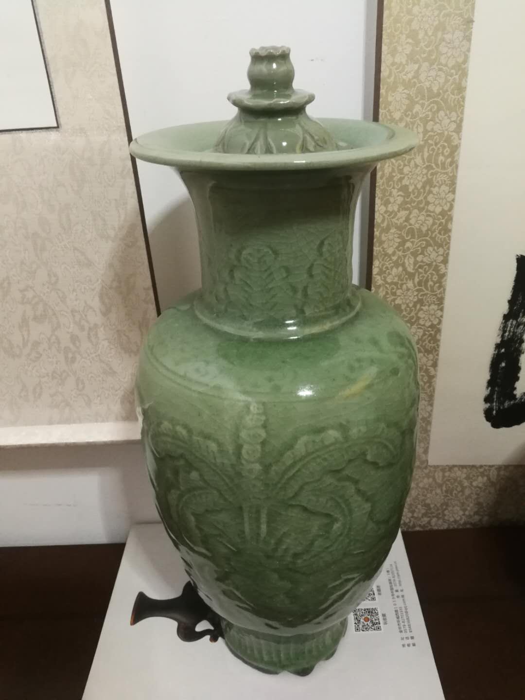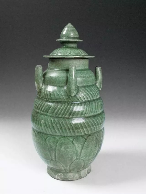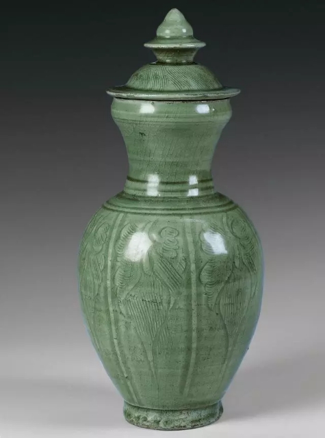 口径8.1、底径6.9、通高29.5厘米。盘口微敛,喇叭形短颈,溜肩,长弧腹,圈足。颈肩相连处各饰两道弦纹。腹部用减地法施六道纵向凸棱,将腹部分为六个区间,每个区间内刻划一花叶纹,中填篦纹,纹饰基本相同。器盖子口,盖面呈覆盆状,上饰篦划纹,呈水波状,盖钮为宝珠状,宝珠腰部有凸沿。通体施青黄色釉,玻璃质感强,釉面有冰裂和缩釉现象。器盖内部、口沿、圈足内部无釉,胎呈青灰色。与浙江龙泉市塔石乡秋畈村北宋元丰元年(1078)墓出土青瓷瓶的器型、纹饰十分相似,年代推测大致在北宋中晚期