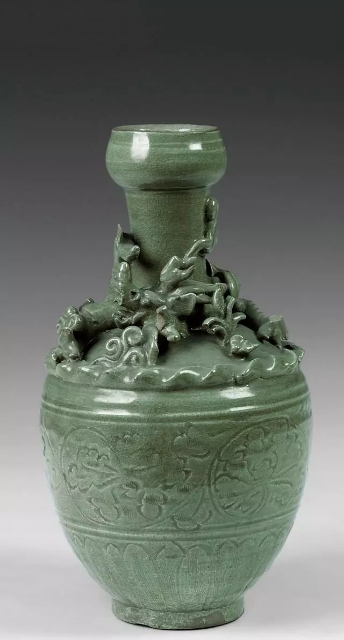口径5.1、底径6.8、高24.8厘米。盂形口,长直颈,圆肩,深弧腹,圈足。肩部装饰一道捏制的波浪纹,其上堆塑一条上下翻腾的龙,四足三爪,周围有花、石、祥云点缀。器腹上下各饰一道弦纹,中间刻划缠枝牡丹纹。胫部刻划仰莲纹,纹饰中填充篦划纹。通体施青黄色釉,口沿与底部无釉。宋代龙泉窑多生产此类以龙虎为主题的堆塑瓶,并称为龙虎瓶。
