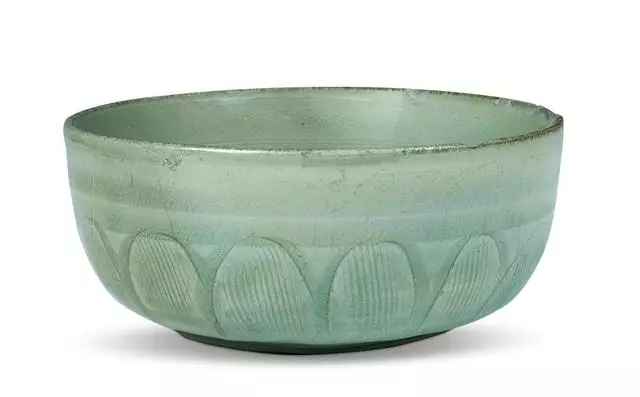 口径5、底径3.5、高5厘米。敛口,折唇,斜直腹,平底微向内凹,腹部刻有仰莲纹,上划有篦纹,通体施青黄色釉。莲瓣纹钵是宋代龙泉窑的典型产品之一,南宋时期也有生产,并且出现了圈足。这件莲瓣纹钵出土于杭州葛岭工地,造型规整,简洁优雅,为宋人的文房用具。