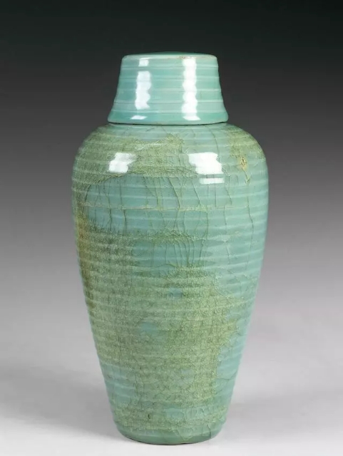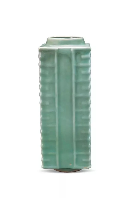 长9.2、宽9.2、高25.5厘米。圆口,短颈,方身,圈足,口径与底径相仿。器身四面有横、竖凸起的直线纹,器身共八节。通体施青绿色厚釉,釉色莹润,足端无釉,露胎处呈灰白色。琮瓶,因其造型似史前玉琮而得名。我们现在所熟知的琮,其实是清末才有的说法。根据台湾大学谢明良的考证,宋人认识中的琮与我们现在所认识的琮有一定的差距。琮瓶的材质除瓷质外还有石质和铜质,后两者目前仅出于四川窖藏,且年代较瓷质的更早。宋代琮瓶具有某种祭仪功能,明人将此种器型的器物称之为“蓍草瓶”,多将其用来插花,成为明代文人案头清供之一。