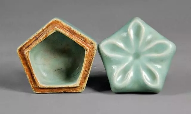 口径5、底径5、高4.4厘米。整器平面呈正五边形,盖母口,盖面塑一五瓣梅花。盒子口,直腹,正五边形圈足。盒身转角近口沿处刻划四道波浪形弦纹,与盖沿处的弦纹相连接,线条流畅,于细节处见匠心。通体施粉青釉,子母口和足端露胎。粉青釉产品为南宋龙泉窑的特色产品之一,釉面光泽柔和,釉色清新淡雅,颇具玉质感。