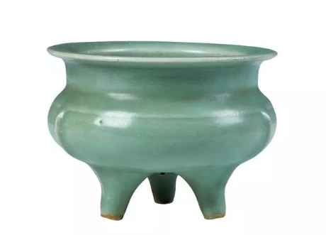 口径11.7、高9厘米。宽折沿,直颈,扁圆腹,下承三乳足。肩部有一周弦纹,腹部至足部各饰一道出筋,三足内侧各有一小孔。整器内外施粉青色乳浊厚釉,足端无釉,露胎处呈灰白色。鬲式炉的器型仿自先秦青铜器中的鬲。宋代瓷器的一大特点就是多仿造先秦青铜器的器型。这类器物的用途应是做焚香用的香炉,南宋词人吴文英《夜行船·赠赵梅壑》一词中有:“古鬲香深,宫壶花换,留取四时春好”的文字相印证。
