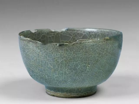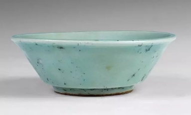 口径12.5、底径6、高4.3厘米。敞口,窄沿,圆唇,斜直腹,圈足。素面无纹饰,通体施粉青色厚釉,足端无釉,呈锈红色,器身薄釉处可观察到白胎。1958年龙泉金村窑址采集,金村是龙泉南区最为重要的三个窑址群之一。这件洗完整无损,造型规整,唯外腹壁有很多黑色的污渍。宋代龙泉窑以釉色闻名,在釉色的筛选上有严格的标准,像此件釉色微瑕的器物就没有经过当时窑工检验,成为一件合格的产品。