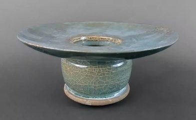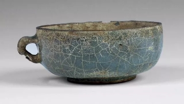 口径8.6、底径4.4、高3.3厘米。直口,浅直腹,矮圈足,上腹部近口沿处置一圆形把手。通体施青灰色釉,釉面布满开片。口沿与足端无釉露胎,胎呈紫黑色。为龙泉窑中的黑胎类产品。