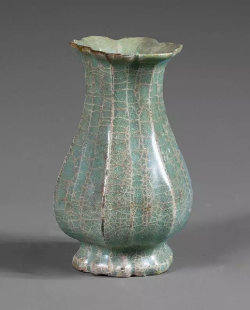 口径5.5、底径5.2、高14厘米。喇叭形六瓣花口,对应的器腹和圈足均呈六瓣花形。束颈,圆弧腹,圈足外撇。通体施青褐色釉,釉面有开片。足端露胎,胎体较薄,呈紫褐色。整齐略扁,为对半合模制成