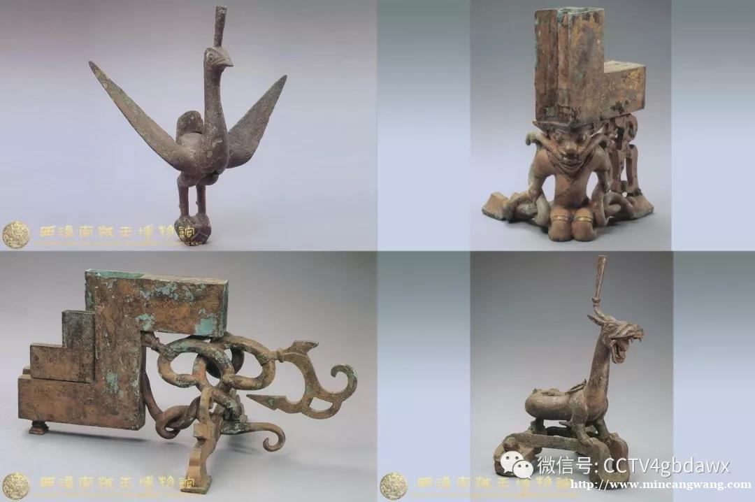 西汉南越王墓出土了近千件文物,这五件铜屏风构件就是其中较为精美的部分,包括朱雀屏风铜顶饰、双面兽首屏风铜顶饰、人操蛇屏风铜托座、蛇纹屏风铜托座各一件,以及蟠龙屏风铜托座一对。