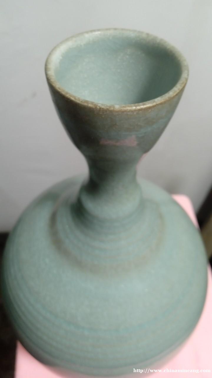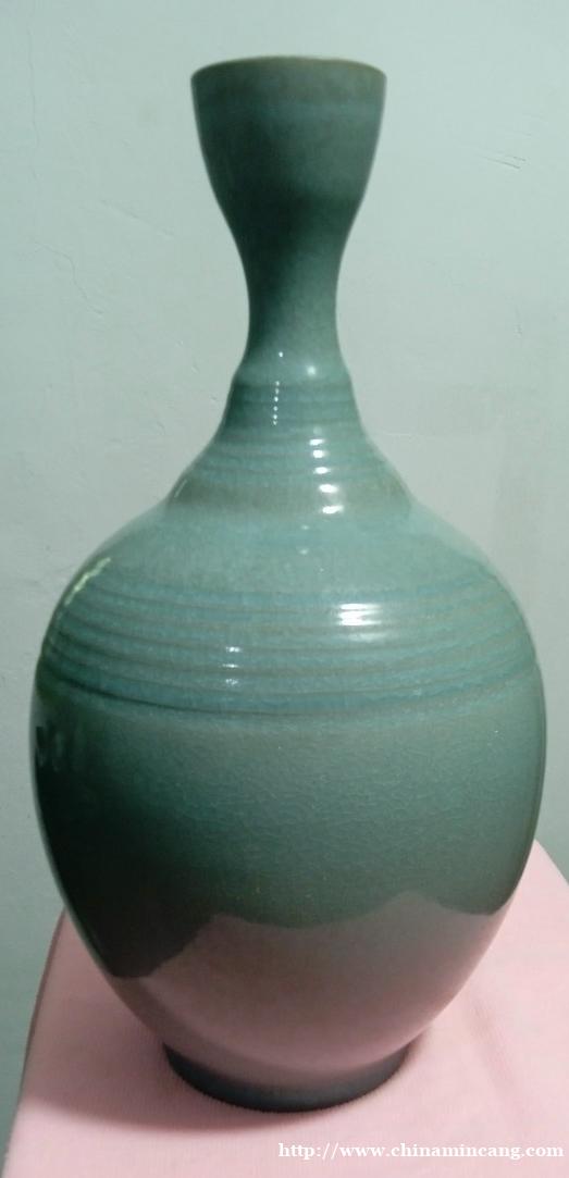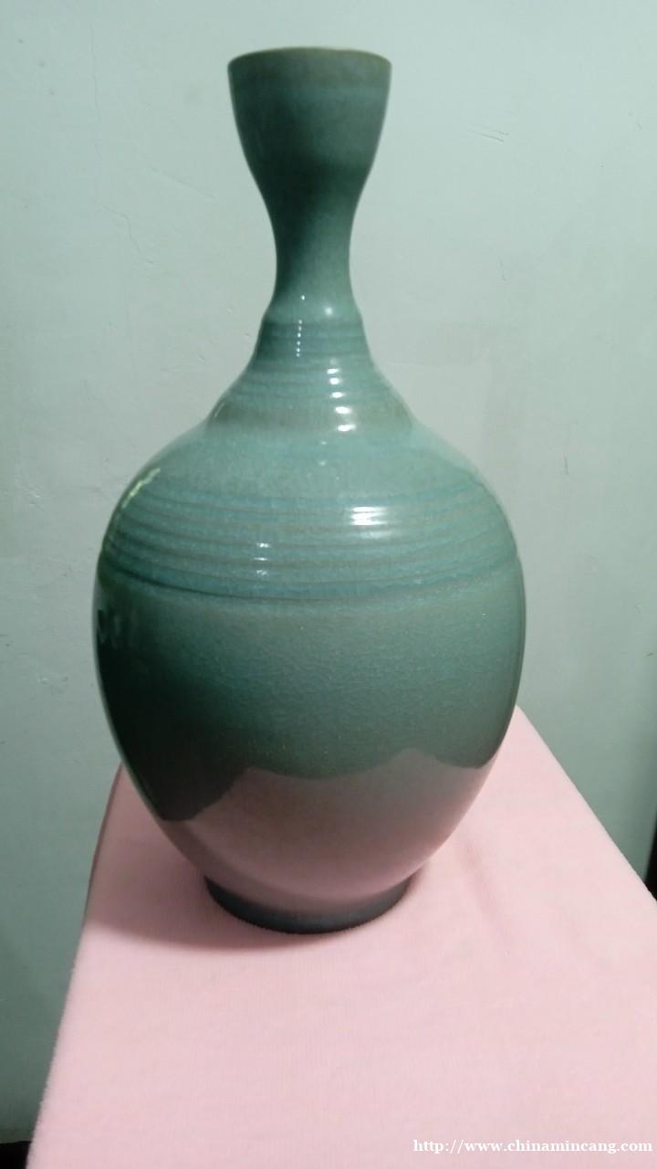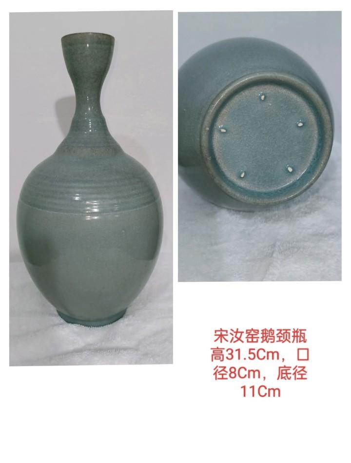 器型优雅别致. 鹅颈设计美感. 造型匠心独具。 弦纹装饰典雅 线条流畅自然。 釉色温润细腻. 雨过天晴惊世色. 干年遗韵型自娇.